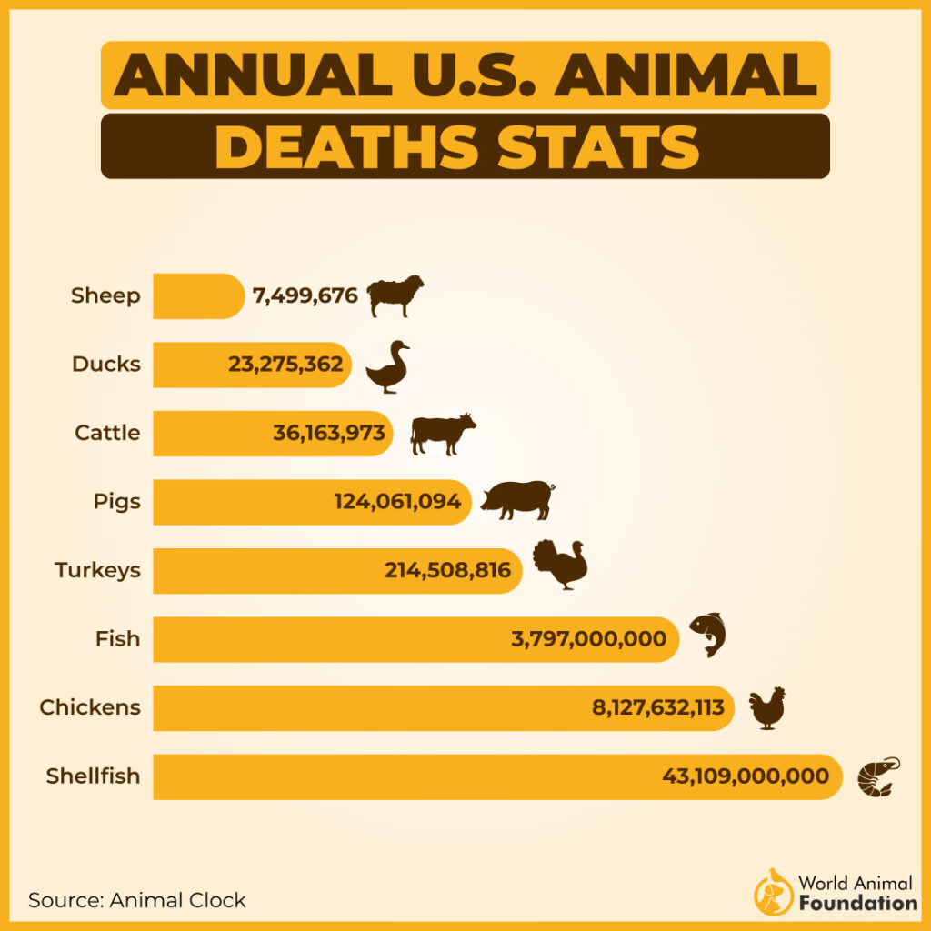 The following chart highlights the staggering number of animals killed each year in the United States for food production, showing the scale of impact across different species.