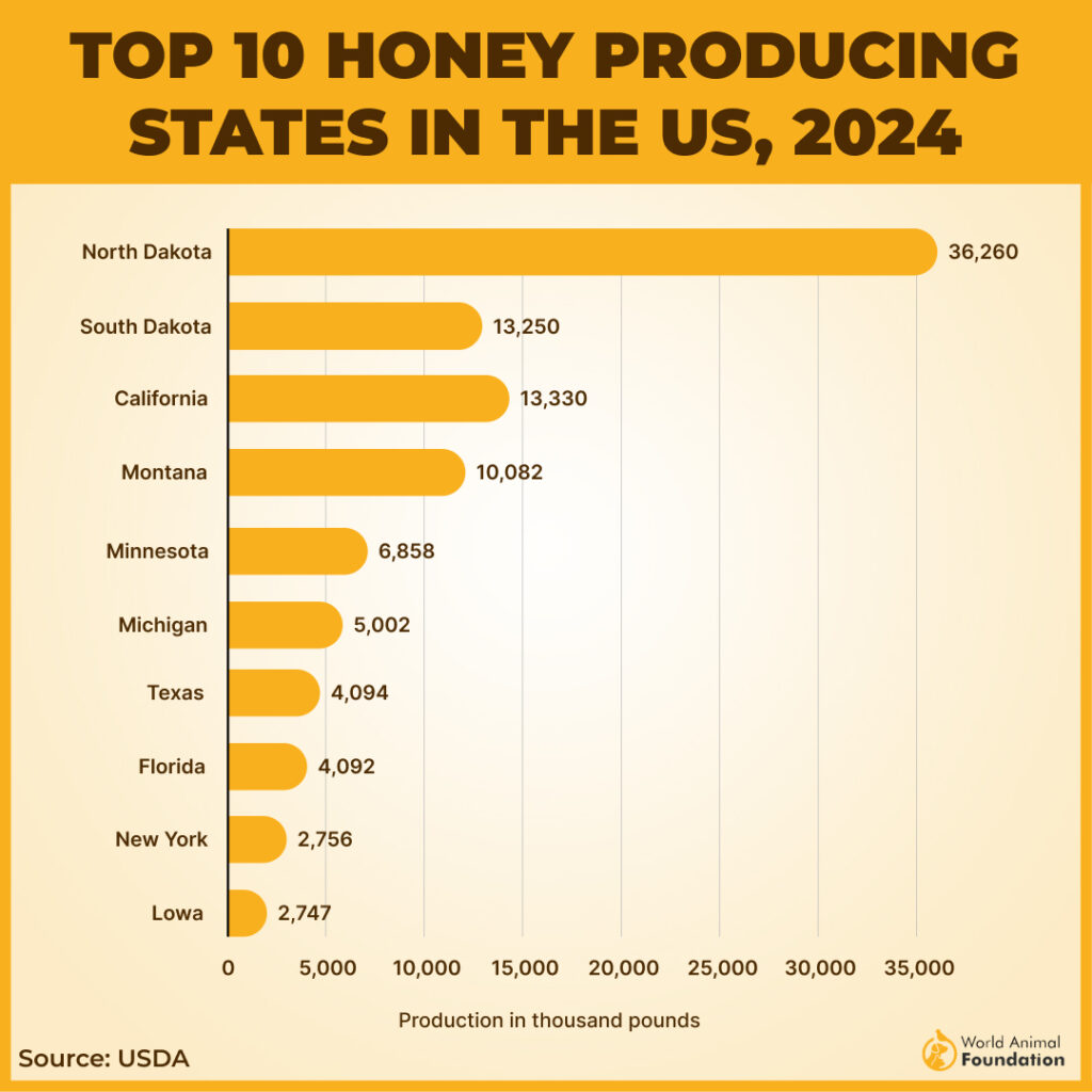 As per stats of 2024, The Highest Honey Production Is in North Dakota, With Above 36.2 Million Pounds (USDA)