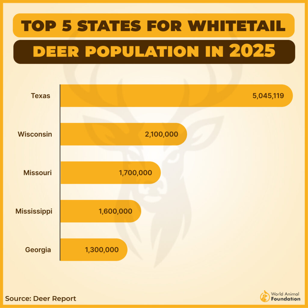 Texas has the highest estimated white‑tailed deer population in 2025, with over 5 million deer.