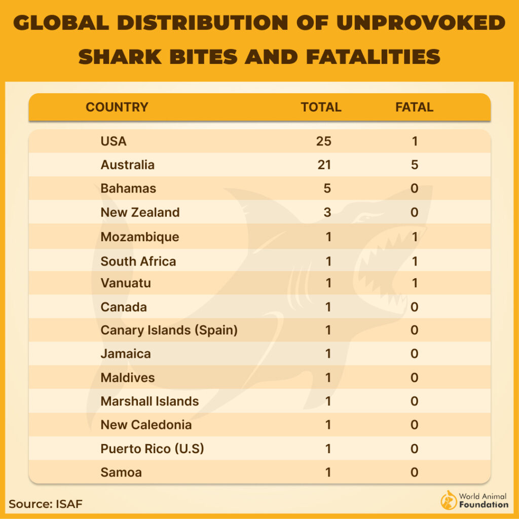 Even minor bites from white or bull sharks can be life-threatening, which contributes to Australia’s higher fatality rate. However, numbers vary each year, and in 2019, 2022, and 2024, there were zero reported deaths from unprovoked shark attacks.