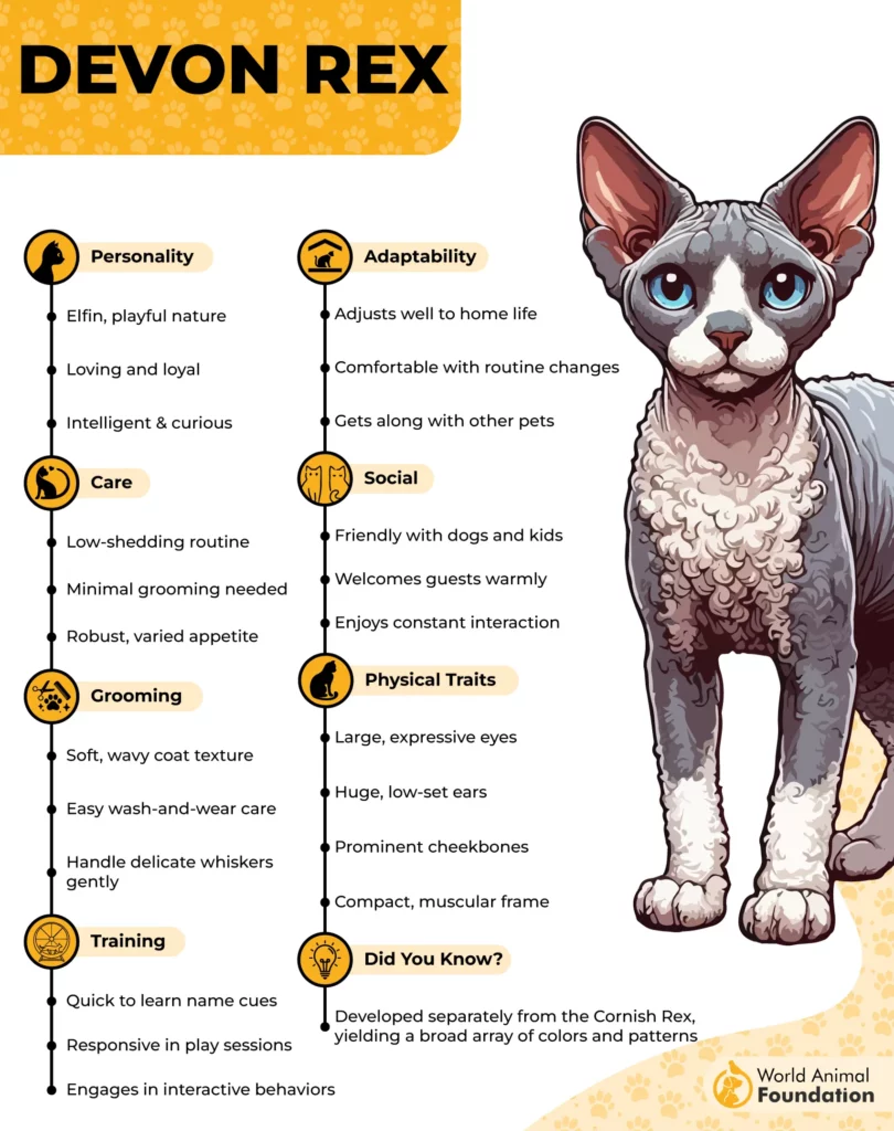 Fun fact: if you’re looking for a social butterfly in the cat world, the Devon Rex cat is your match. These cats have a sweet disposition and hate being left alone, so they’re perfect for people who want a companion by their side at all times.