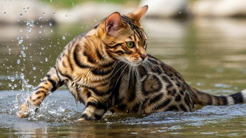 Bengal cats are especially famous for their fascination with water. Many willingly splash in fountains, investigate ponds, or trail their owners into the shower, showing curiosity rather than caution around wet environments.