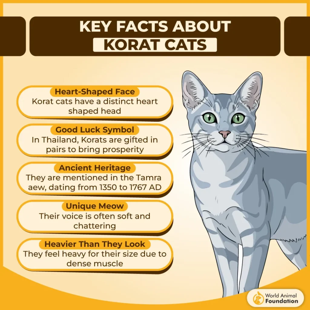 The Korat is another breed that comes only in a beautiful silver-blue coat. Their fur is short and smooth, needing just one to two brushings a week to stay shiny and healthy. One of their standout features is a heart-shaped face paired with bright green, round eyes.
