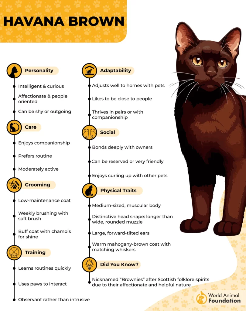 Havana Browns are rare and striking cats, instantly recognizable by their rich, chocolate-brown coats and vivid green eyes. This breed originated from a cross between Siamese and black domestic cats, resulting in a uniquely beautiful feline with an elegant, slender body. Their deep, warm brown fur is smooth and glossy, giving them an almost luxurious appearance.