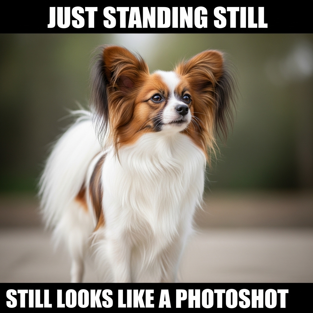 The Papillon, whose name comes from the French word papillon, meaning butterfly. Well, the name describes its features too, their distinctively large, fringed ears that are kind of like butterfly wings. Also, they have a straight, long coat that adds more grace to their appearance.
