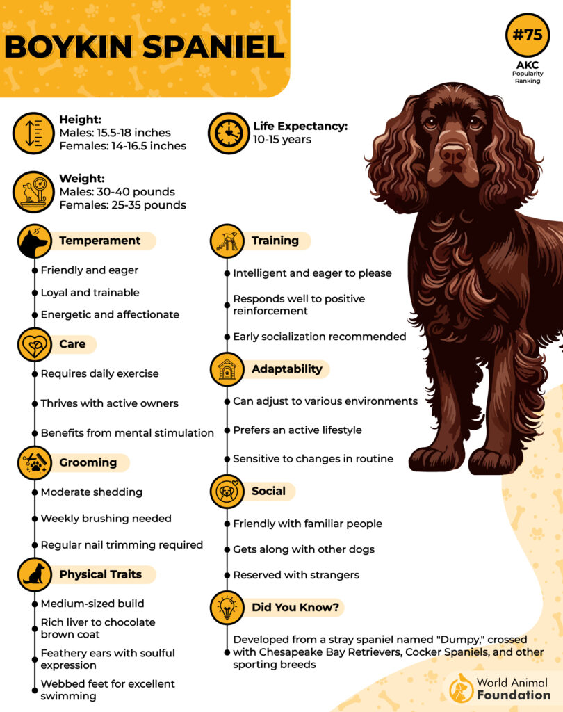 According to the AKC, the Boykin Spaniel is described as a medium-sized flushing and retrieving breed with a distinctive rich brown coat, noted for being enthusiastic, cheerful, eager to work, and highly trainable.