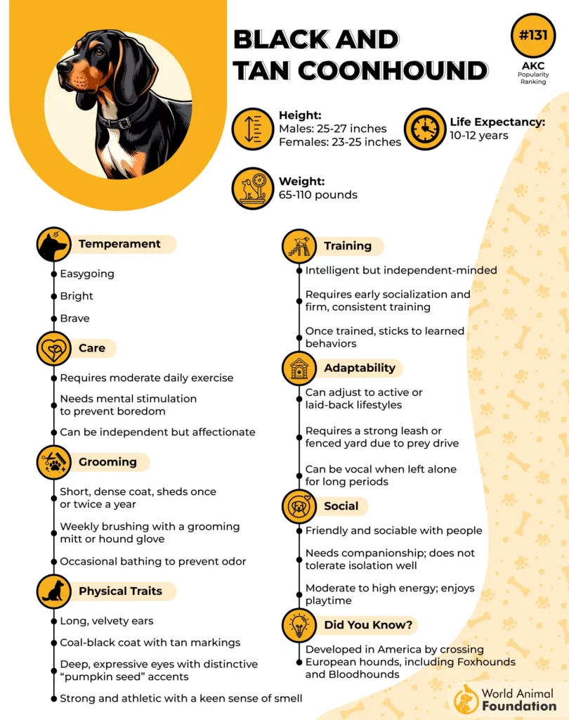 Often called the American Black and Tan Coonhound, this scenthound is known for its long ears, bold coloring, and famously steady disposition. Bred from classic hound lines, it stands out for its even-tempered nature and a nose that can follow a trail long after other dogs have given up.