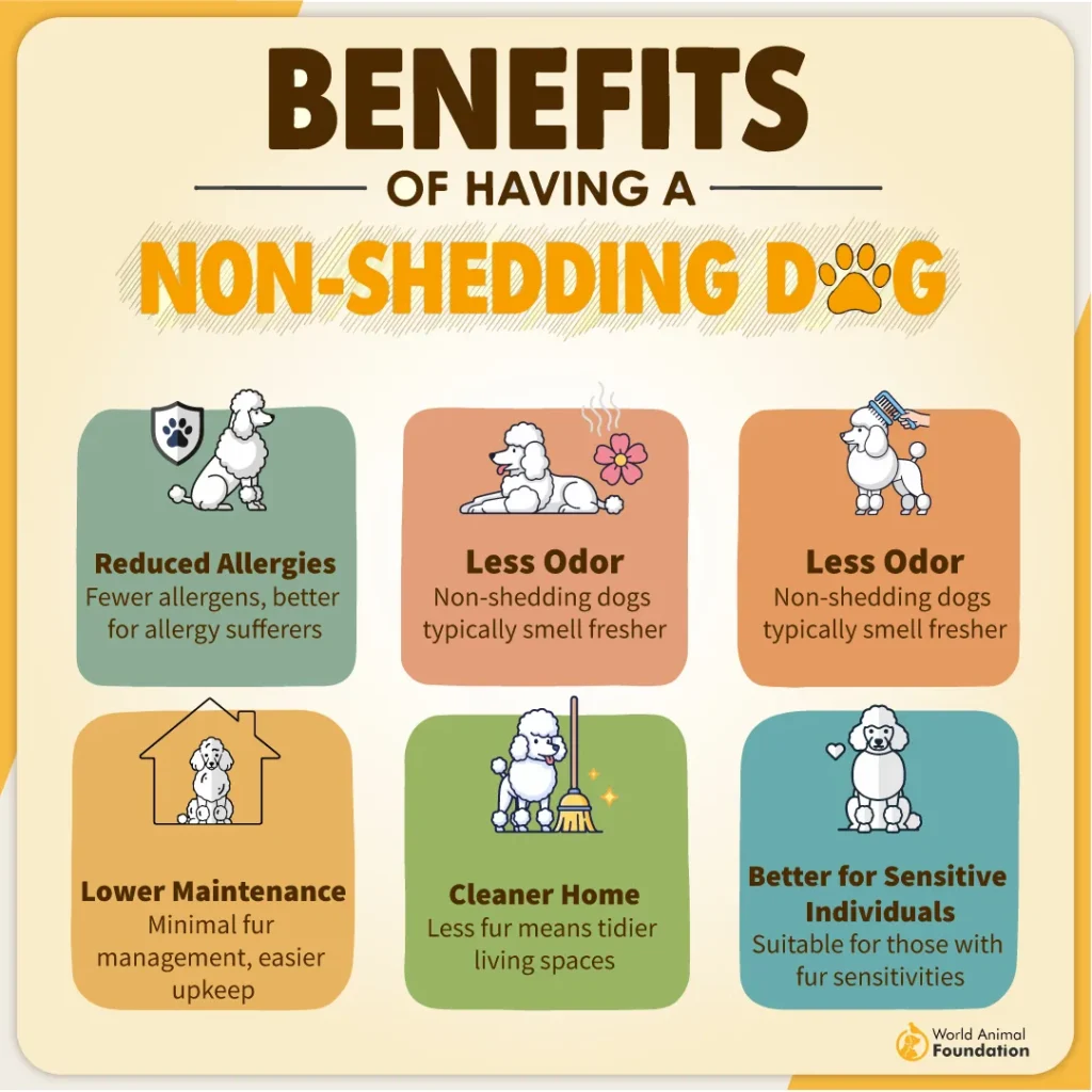 Low-shedding breeds are valued by pet parents who love to own dogs but are allergic to pet dander. Less dirt and dander mean lower chances of allergies and reduced cleaning requirements. These pooches shed minimally and are usually hypoallergenic as well.