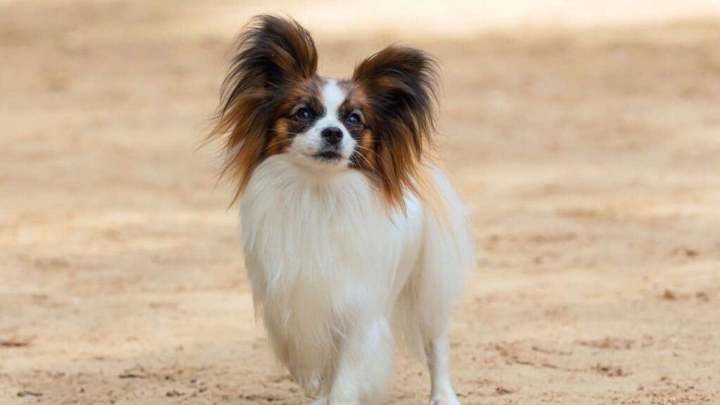 A butterfly dog. One of the oldest breeds, in the 16th century, Papillons were often featured in Renaissance paintings. This dainty small dog has butterfly-shaped ears and a luxurious white coat. The popularity is not only limited to its elegant looks but also expands to its smartest brain.
