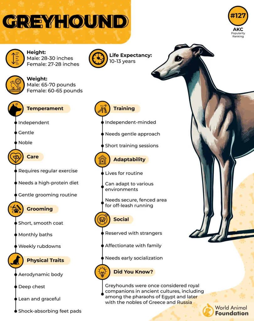 Fun Fact: Despite their speed on the track, Greyhounds are nicknamed “45-mile-per-hour couch potatoes” because their favorite activity is relaxing—sometimes for hours on end.