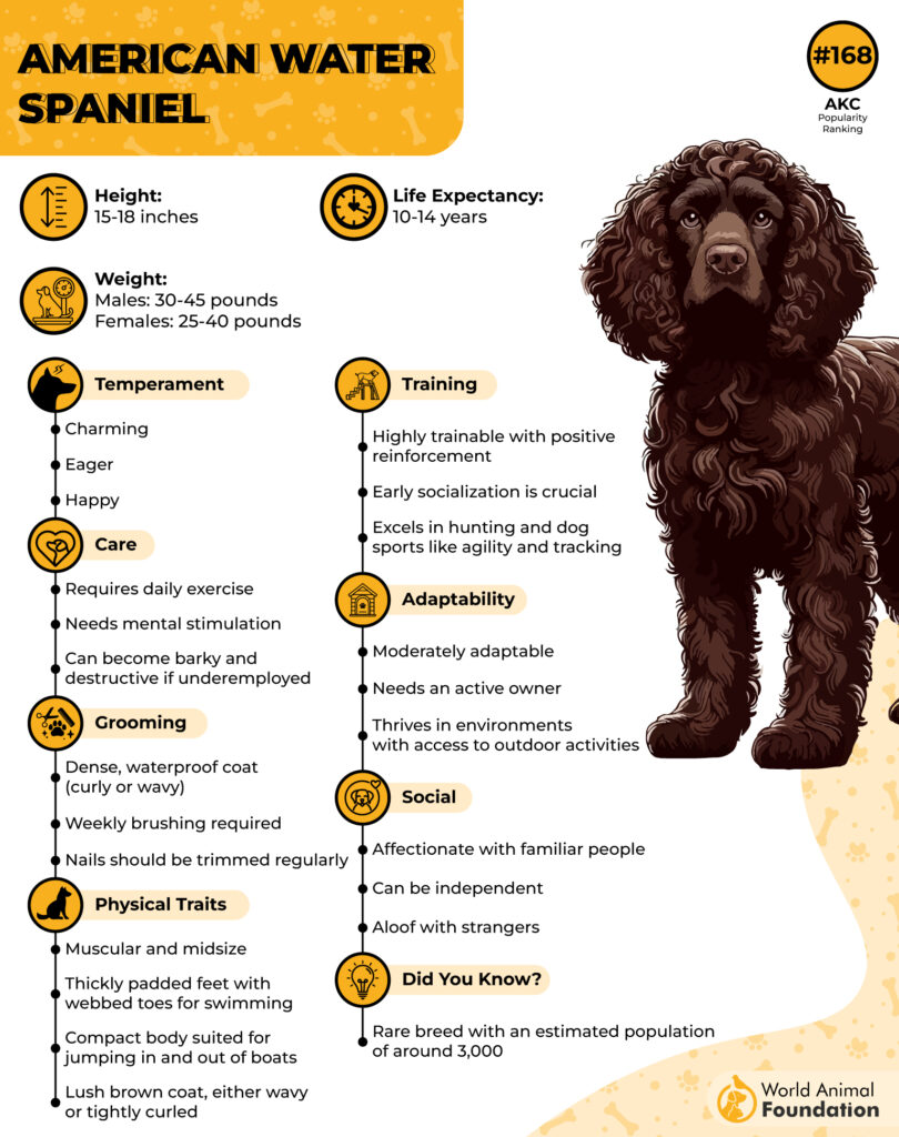 As mentioned by PetMD, American Water Spaniels are strong-willed, responding best to positive reinforcement. Early socialization helps them feel confident around new people, pets, and children, ensuring they grow into well-rounded, obedient hunting companions.