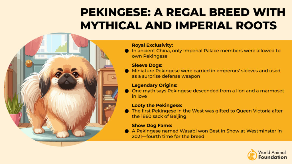 Regal, loyal, and surprisingly funny, the Pekingese dogs have been adored by Chinese emperors for centuries. These are calm, confident, and affectionate dogs with a personality that is just the right amount of sass.