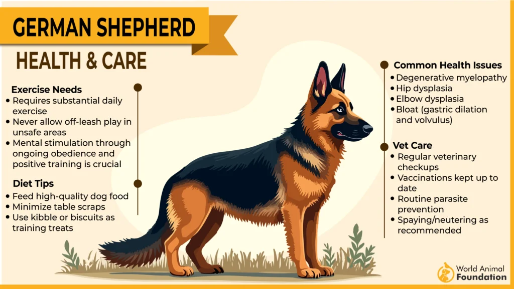 German Shepherds have an average lifespan of 9–13 years. They are generally robust, though they can be predisposed to hip and elbow concerns. Regular screenings recommended by organizations such as the Orthopedic Foundation for Animals help monitor joint health.
