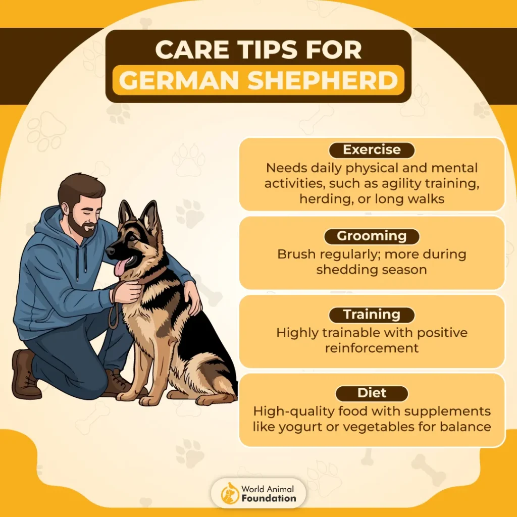 German Shepherds need regular physical and mental activity to stay balanced. Their working heritage demands daily outlets such as structured training, agility work, or brisk exercise. This helps prevent restlessness and promotes long-term health.