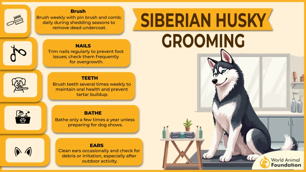 Bathing: Occasional; Huskies are naturally clean and often smell “doggy-fresh.”