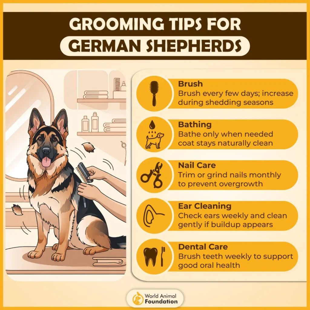 German Shepherd Dogs have a double coat with a soft undercoat and tight outercoat. These large dogs shed heavily, especially in winter and autumn. Thus, regular grooming is necessary and can be done at home easily via regular brushing.