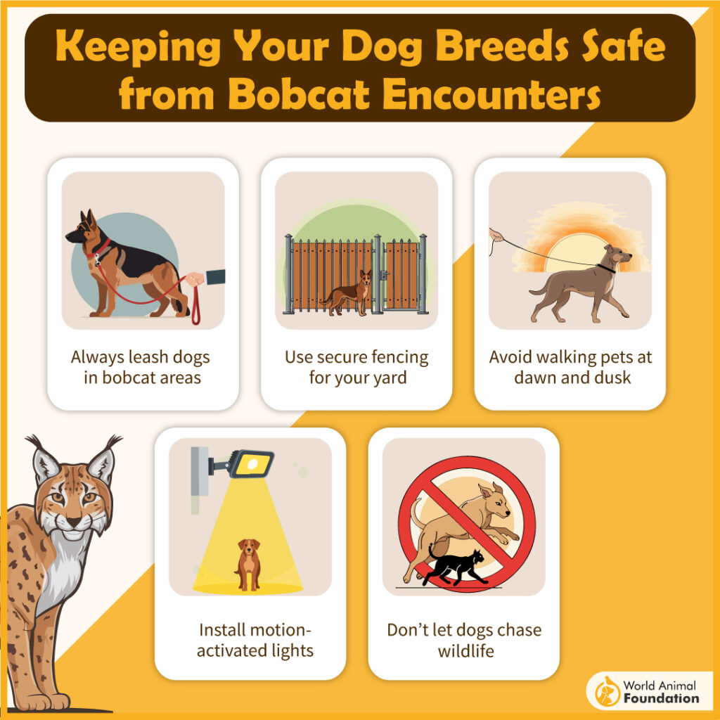 Bobcats are vicious and formidable predators who are a threat to smaller dogs and may leave larger dogs injured with their sharp claws and killer bites. All the above-mentioned breeds are somewhat strong enough to survive a combat against these dangerous cats.