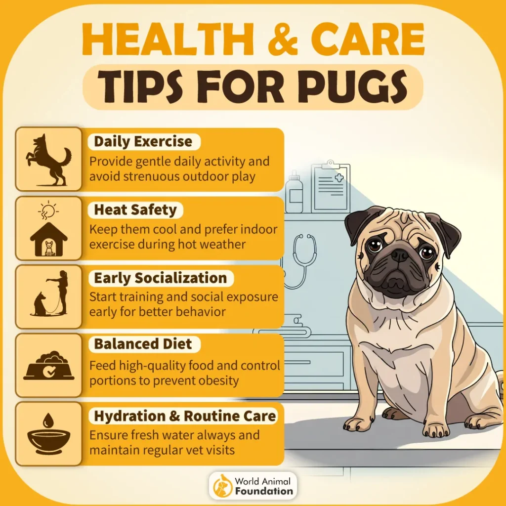 They are primarily indoor dogs and enjoy low-impact activity like short walks or gentle games of fetch. Overexertion can cause respiratory strain, so exercise should be light but consistent. Despite their moderate activity needs, Pugs bring endless affection, enthusiasm, and charm to their owners’ lives.
