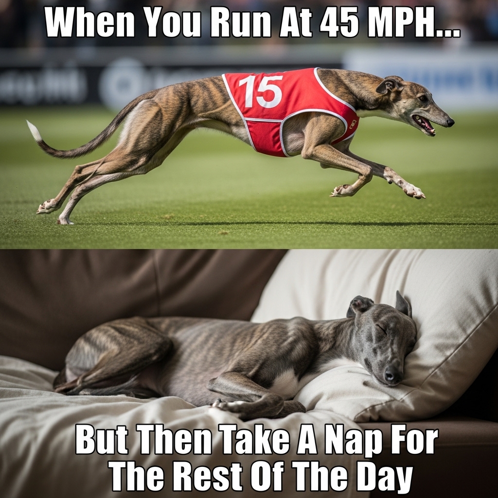 Known for its calm temperament, the Greyhound is content to spend most of its time lounging indoors. It enjoys short bursts of sprinting but otherwise prefers a relaxed, laid-back routine.