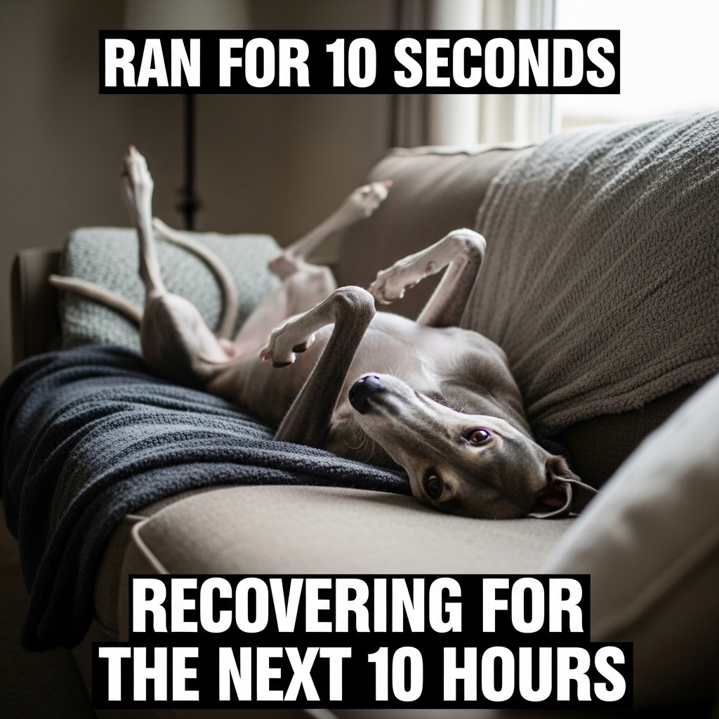 Fun Fact: Greyhounds can reach speeds over 40 mph, yet most are nicknamed “45-mph couch potatoes” because of how much they adore relaxing once indoors.
