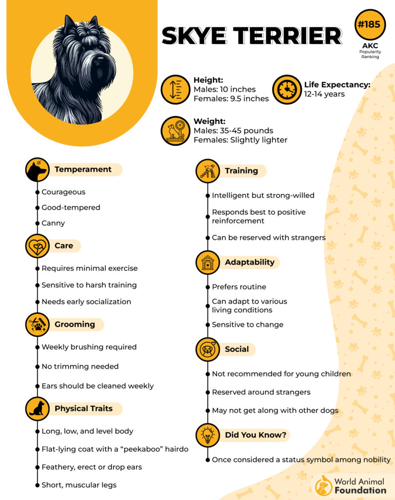 Skye Terriers are intelligent and independent, responding well to consistent, positive reinforcement during training. Though reserved with strangers, they form strong bonds with their families, showing playful curiosity and gentle affection.