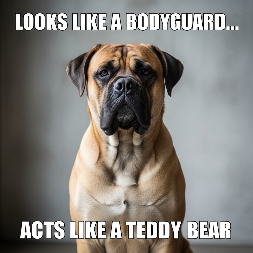 If “gentle giant” ever needed a poster dog, the Bullmastiff would be front and center — muscles flexing, drool glistening, and heart absolutely full of love for its family.