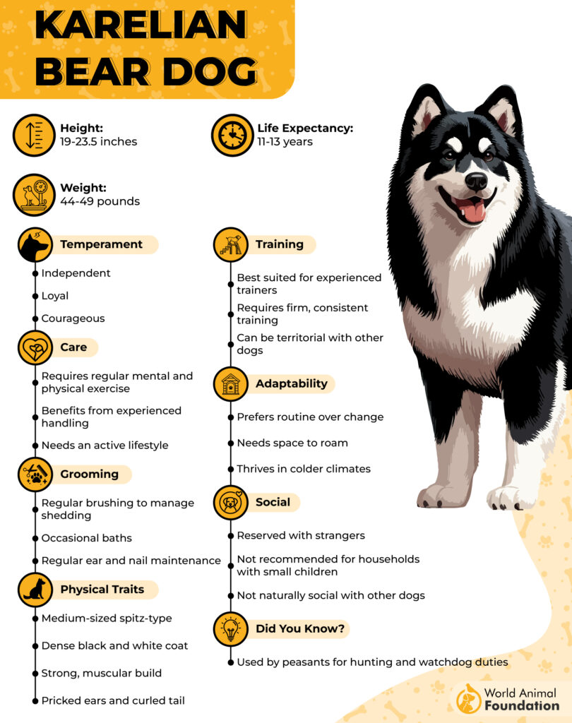 The Karelian Bear Dog is a fearless and devoted hunting breed from Finland, known for its unmatched courage and strong-willed nature. Originally bred to hunt large game like bears and moose, this dog embodies independence, confidence, and focus under pressure. Its bold temperament makes it a legend among working breeds.