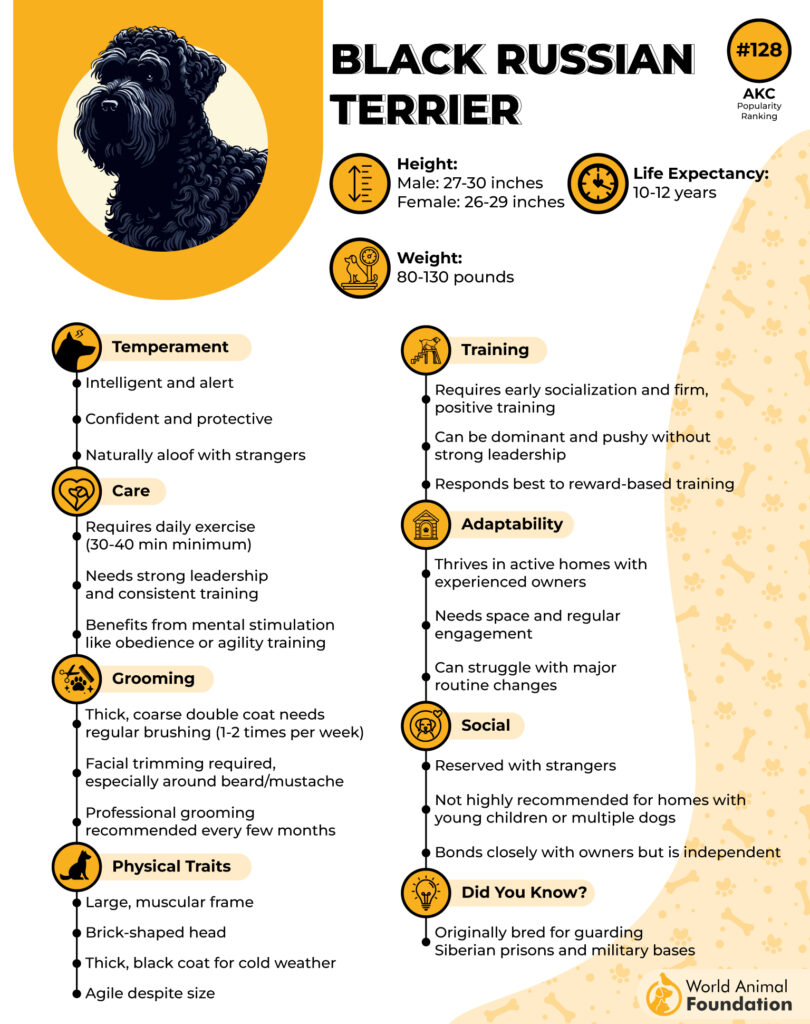 Self-assured BRTs are loyal and affectionate for their owners and a bit reserved around strangers. Being intelligent dogs, Black Russian Terriers are highly trainable. These large working dogs are highly active and excel in canine sports like obedience, agility, and tracking.