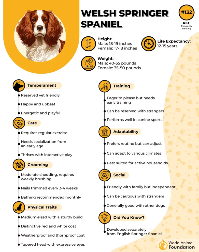 According to Purina, Welsh Springer Spaniels, also known as affectionate Velcro dogs, happily follow their people around the house. Loyal, playful, and attentive, they make loving companions both indoors and outdoors.