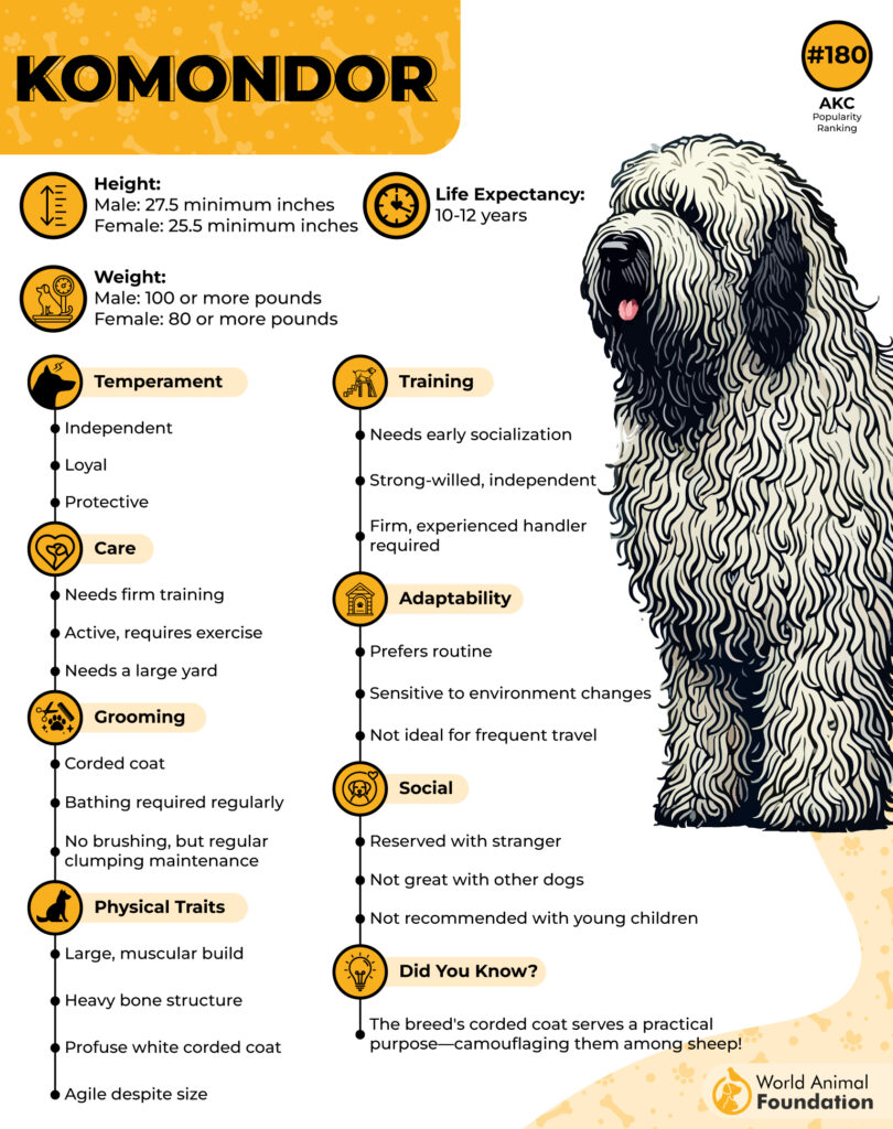 They are very loyal and love family life. Komondors need space to move around and regular exercise. Their coat needs care and brushing, but it keeps them safe from cold weather. They are calm at home but alert if something is wrong.