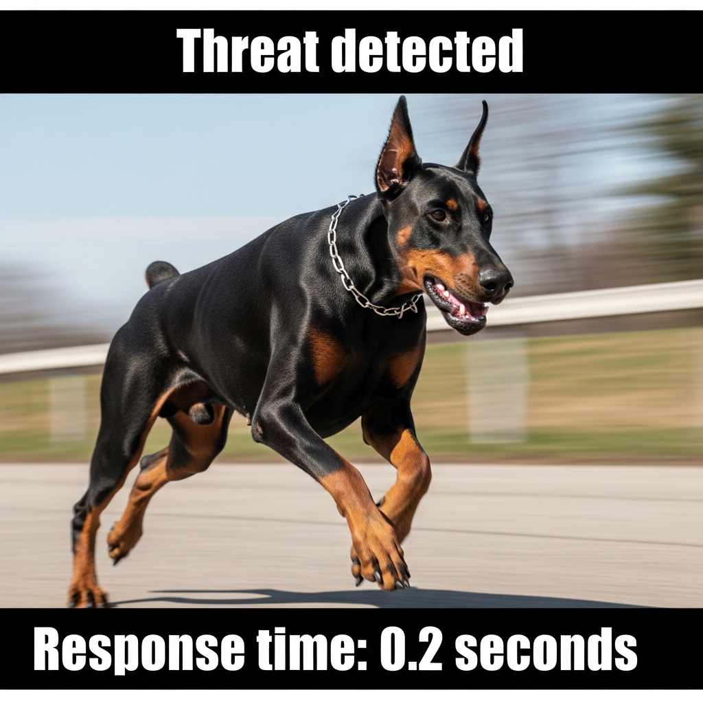 Strong protective instincts. Doberman Pinschers are known for speed, focus, and being incredibly loyal. They are one of the fastest dog breeds on the planet, and will be at the top of any threat in the blink of an eye.
