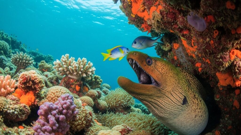 It is a master of tight spaces. It hunts by smell, sliding through cracks and crevices in the coral to find sleeping fish or octopus. Once it bites, it uses a terrifying hidden weapon. Inside its throat, it has a second set of jaws called pharyngeal jaws. These inner jaws shoot forward into the mouth, grab the prey, and pull it down into the stomach.